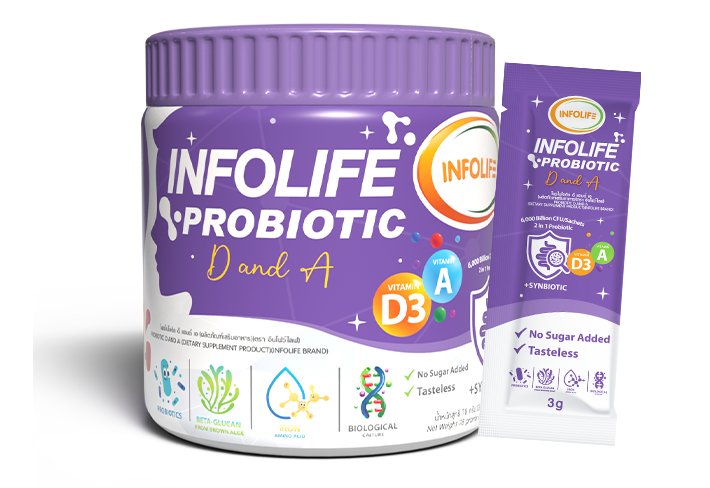 Infolife Probiotic D&A ผลิตภัณฑ์เสริมอาหารสำหรับเด็กที่รวมจุลินทรีย์สายพันธุ์ดี พร้อมวิตามิน D และ A ช่วยเสริมสร้างภูมิคุ้มกัน ปรับสมดุลลำไส้ ลดปัญหาท้องเสีย ท้องผูก และภูมิแพ้ พร้อมสนับสนุนการดูดซึมแคลเซียมและพัฒนาการด้านการมองเห็น ปลอดภัย ไม่มีสี ไม่มีกลิ่น ไม่แต่งรส ทานง่าย เหมาะสำหรับเด็กเล็กตั้งแต่อายุ 6 เดือนขึ้นไป