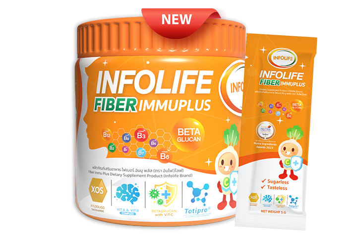 Infolife Immu Plus ผลิตภัณฑ์เสริมอาหารไฟเบอร์ชนิดชงดื่ม สำหรับเด็กอายุ 6 เดือนขึ้นไป อุดมด้วยพรีไบโอติกและโพสต์ไบโอติก ช่วยปรับสมดุลลำไส้ ส่งเสริมการขับถ่ายอย่างเป็นธรรมชาติ ลดอาการท้องผูก ท้องอืด พร้อมเสริมภูมิคุ้มกันด้วยวิตามิน C, A และ B-Complex ปราศจากสี กลิ่น และรสชาติ รับประทานง่าย ปลอดภัย ได้มาตรฐานการผลิตระดับสากล