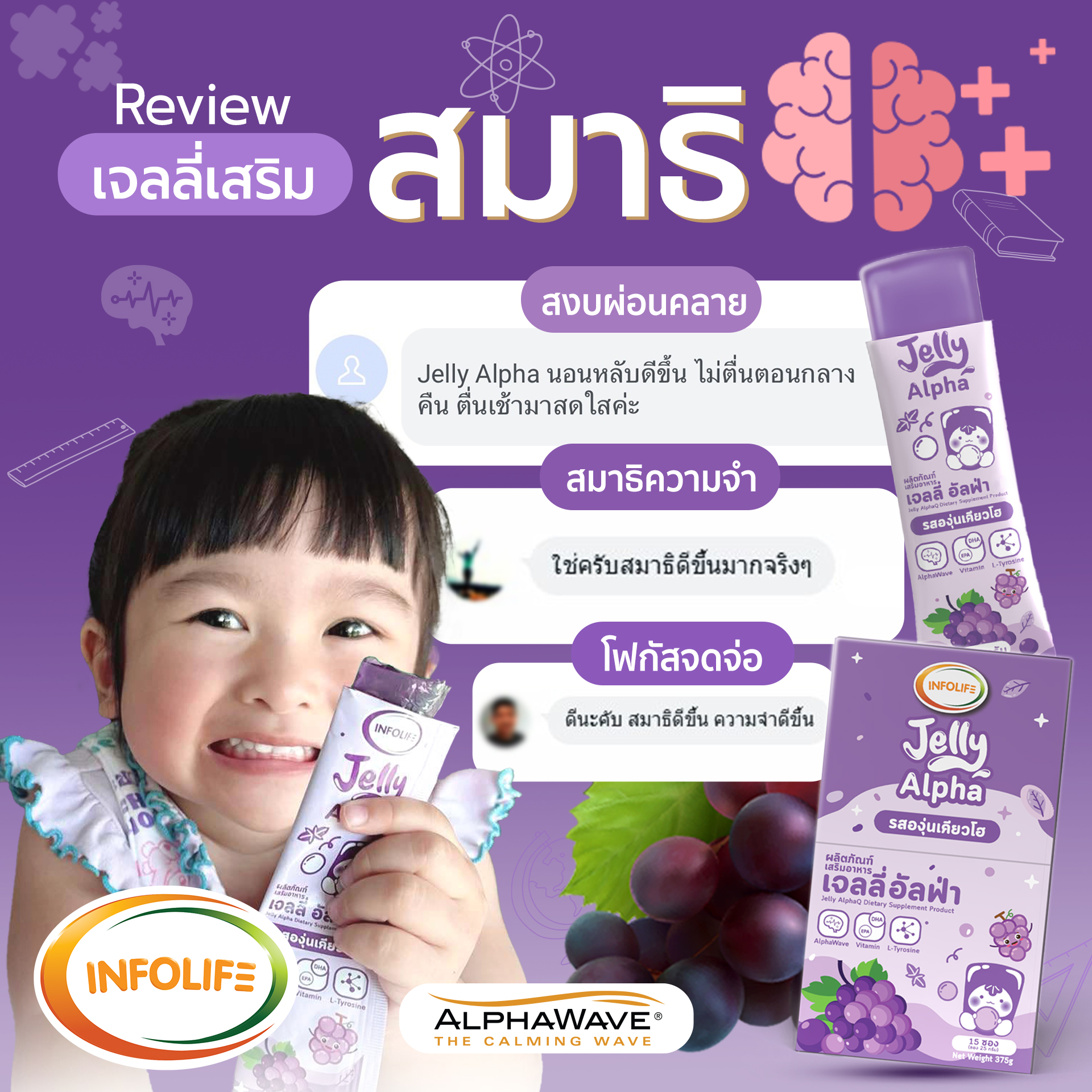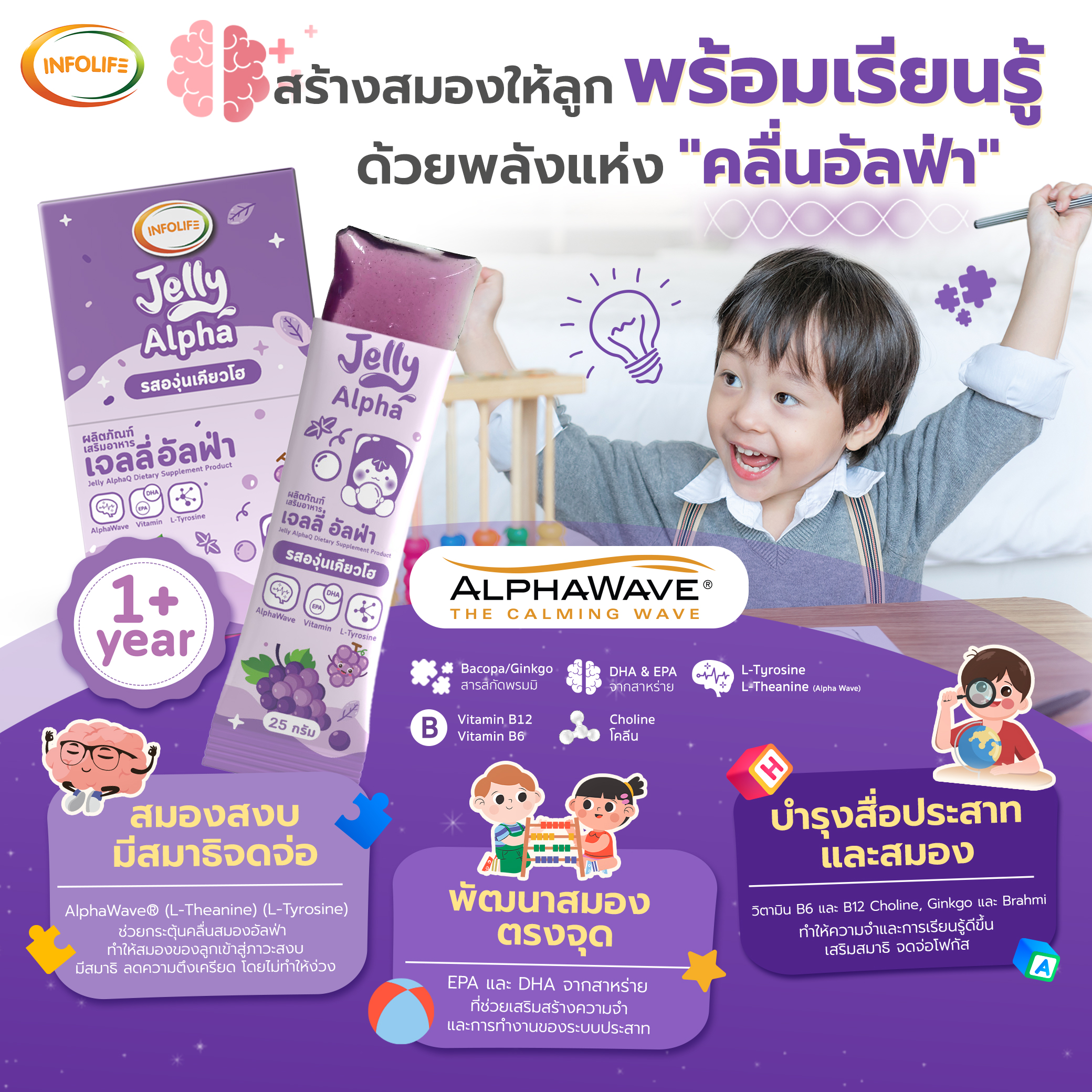 เสริมศักยภาพสมองให้ลูกน้อยพร้อมเรียนรู้ในทุกสถานการณ์ ด้วยนวัตกรรม AlphaWave® L-Theanine ที่ช่วยปรับคลื่นสมองให้อยู่ในภาวะผ่อนคลายแต่มีสมาธิสูง พร้อมด้วย EPA, DHA และวิตามินบีรวม เพื่อการจดจ่อ การเรียนรู้ และความจำที่ดีเยี่ยม